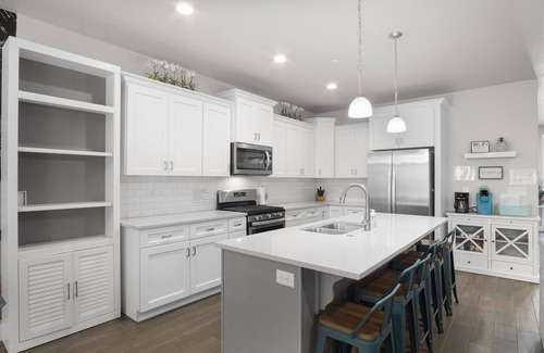 The ultra-modern kitchen features a sleek subway tile backsplash, a center island that doubles as a breakfast bar, stainless steel appliances, Edison-style light fixtures, and expansive counter space. Swing by the local grocery store, stock up on your favorite groceries and store them in the large refrigerator and custom cabinets. At meal times, gather around the formal dining room table and enjoy good food and good conversation with the people you love the most.