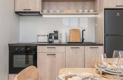 The kitchen is well equipped with appliances such as an induction stove, oven, refrigerator/freezer, toaster, kettle and a Nespresso coffee machine.
