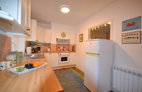A fully fitted cottage style kitchen with dual aspect windows, offering a washing machine, fridge/freezer, microwave and electric oven with a four ring hob and extractor fan above. There is a seating area with a dining table, chairs and bench seat and the back door leading out to the patio and garden