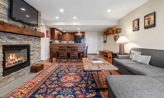 Main level: Living room w/fireplace & flat screen TV, gourmet kitchen and eat-in area. MASTER SUITE has a king bed, flat screen TV, bathroom with Jacuzzi tub. The second floor includes two large bedrooms. The first has a queen bed & entertainment area, & the other 2nd floor bedroom has 2 sets of bunk beds(with double beds on the bottom) and one trundle bed. There is a second floor bathroom. Air conditioning in upstairs bedrooms and a portable AC for the downstairs master bedroom. This Condo is ideal for a large family or two. In winter during ski season, maximum TV package and Hulu streaming TV, inc. HBO and others. Exclusive access to OWNER'S LOUNGE in the lobby that has a social room for small gatherings and a pool table, foosball, games and TV. Amenities include a private ski locker and free wireless internet. Access to the nearby health club & pool for a daily fee.
