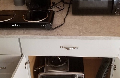 This beautiful studio is attached to the solar powered property that is completely off grid. It features heated floors, UHD TV with Direct TV, king bed with hotel bedding, free Wifi (although slow), and a private porch. There is a small kitchenette with electric cook top, toaster oven, and mini fridge.