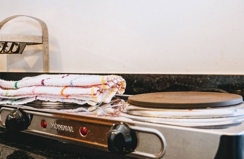 Additionally, it features air conditioning for your comfort, a refrigerator, water purifier, and a two-burner portable electric cooktop, perfect for your meals. To make life even easier, you'll find a blender, sandwich maker, microwave, and an iron for your convenience.