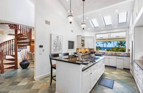 High vaulted ceilings, overhead fans and large windows keep the feelings airy and breezy at Fleetwood Villa. The living area includes a plush sofa and swivel chairs around a built in entertainment center. The formal dining area with its large wooden table makes a great place to share a special announcement with your loved ones or entourage. Up the spiral staircase, you will find a cozy loft with a little extra privacy and a gorgeous panoramic view of the neighboring island of Molokai. The fully equipped kitchen features a convenient breakfast bar.