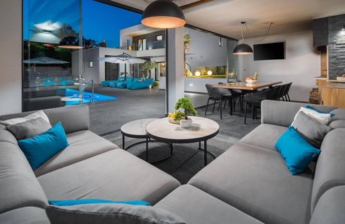 The impressive villa with modern architecture and design offers its guests maximum comfort. This beautiful villa is not only visually appealing, but also impresses with its quality and functionality. It is located in the interior of Istria, surrounded by greenery, on a fenced plot of about 1000 m², where a lot of peace and privacy is offered. The interior extends over the first floor and the second floor. The open spaces consist of a large living room with fireplace, as well as kitchen and dining area, while each bedroom has its own bathroom with air conditioning and TV. Huge expanses of glass flood the rooms with light and provide direct access to the terraces, which face the garden and pool area. In the garden, the refreshing pool with sunbathing area and outdoor kitchen, next to which is a cozy lounge, await you. Even the little guests will not be bored in this dream house, because here many game facilities provide fun and games.