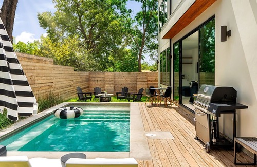 Experience luxury and convenience in our 5-bedroom, 3.5-bathroom home, perfectly located between the airport and downtown. Just a 12-minute ride from the airport and 5 minutes from UT Football Stadium, Moody Center, Rainey Street, and 6th Street. Enjoy top-notch amenities, including a pool, two balconies with downtown views, a ping pong table, pool table, and foosball table. Steps away from 10+ restaurants, bars, and coffee shops, and quiet surroundings. Ideal for a luxurious and vibrant stay!