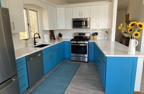 Our home has a renovated kitchen and renovated main bath, We have 3 bedrooms and 2 full baths. The entry level has two bedrooms and a full bath. One of these bedrooms has a queen bed and a double bed. The other has two bunk beds: (1) an ex long twin over queen and (2) full over full beds. The washer and dryer are also on the entry level. The main floor is an open concept area with modern kitchen, dining area, living room and den. This level has the master bedroom with a queen bed and a full bath. There is also a pull out queen sofa a bed in the den. A loft (accessible via a spiral staircase) offers great views; a nice area to read a good book or play a game.