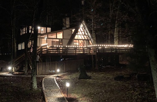 Enjoy Innsbrook Resort while relaxing at Dragonfly Dreams. Our lakefront chalet located on Whitetail Creek Lake has four bedrooms and two full bathrooms. This chalet sleeps 12 comfortably with a king size bed in the master bedroom, then upstairs has a queen size bed and the other two bedrooms each have a full size bed plus a set of bunk beds. There is a child safety gate at the top of the stairs as well as outside on all the stairs. The upstairs bathroom has a full bathtub and shower combination. The stairs to the second floor are the standard stairs in the Innsbrook Chalets.