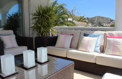 The bedrooms at first floor level lead out onto a spacious wrap-around terrace, which has a large outdoor sofa, offering the perfect setting for those end-of-day sundowners and spectacular views to El Portet and across the sea to Moraira and Calpe.