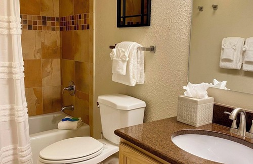 The master bedroom has a king-size bed and an ensuite bathroom. The guest bedroom has a queen bed and a twin bed to accommodate the sleep arrangements your group may need. The second bathroom, with a combination tub-shower, is adjacent to the guest bedroom. Each of the two bathrooms have heated floors, a magnifying mirror and blow dryer.