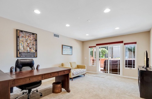 Inside, guests can enjoy relaxing in the well-appointed living room. When the group gets hungry, prepare meals together in the spacious kitchen sparkling with stainless steel appliances and granite counters. The remote worker or student of the group can find a quiet place to work in the home office. At night, rest your head in one of four bedrooms, each with their own unique designs and amenities.