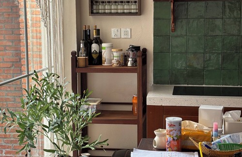 The fully equipped kitchen can also be used as a workspace. Refrigerator, Induction cooker, Fruit slow pressing machine for fresh juices, dishes, cutting, wine glasses and much more