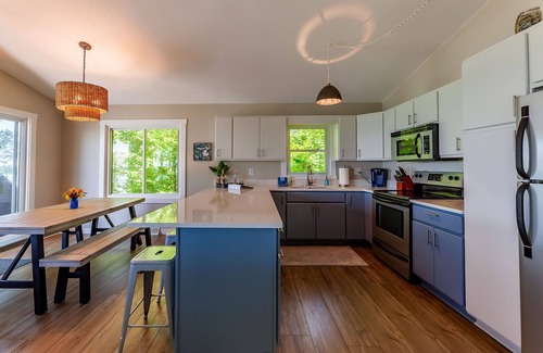 This home comfortably sleeps 8 and features plenty of dining and social seating for all your friends and family to enjoy meals, play games, and just catch up over a glass (or 3) of wine! With a fully stocked kitchen, appliances, and grill, you'll be set for all your cooking needs.