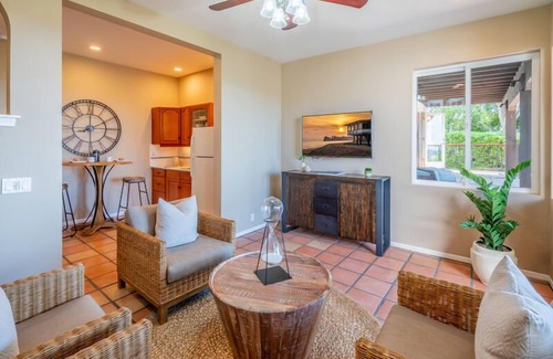 As a welcoming point of entry behind wrought iron gates, a tranquil fountain sets the tone for a relaxed and memorable stay. White stucco walls contrast with Saltillo tile patios and lush gardens in a pleasing Mediterranean theme outside, and a comfortably appointed remodeled home inside. The house functions beautifully as a dual-living property with both floors connecting inside and out, and also accessible with private entrances if desired.