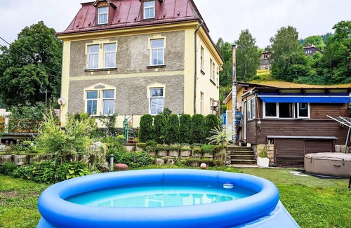 Villa in Desná v Jizerských horách offers a comfortable stay with amenities like a swimming pool, yard, internet WiFi, and parking. This three-story vacation rental is located just 500 meters from the town center and provides a sunny, lively atmosphere for your holiday.