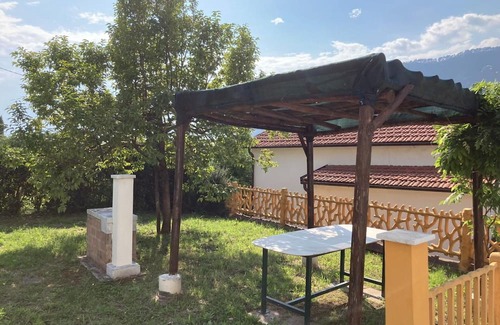 Garden: barbecue, al fresco dining, dining table (people: 5), garden furniture, enclosed property.