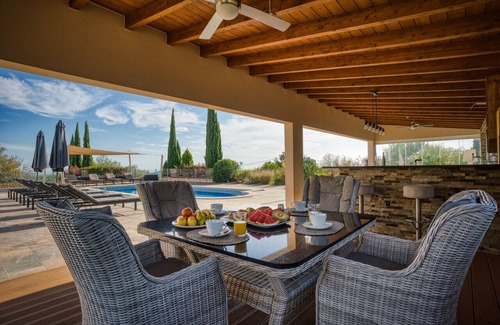 From the living room and impressive pool bar you overlook the large crystal-clear heated private 12m x 5m swimming pool. This is a much healthier saltwater type pool which we test and maintain at least weekly - more often in the summer months. The pool bar offers shade during the day and an area to relax and socialise in the evening, and there is also shade offered by a sailcloth canopy at the opposite end of the pool.