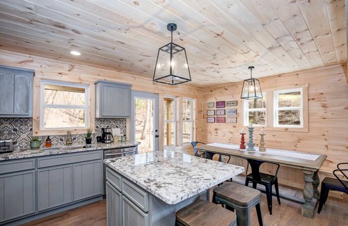 Warm and inviting, this cozy cabin in the Georgia mountains is just the sanctuary you've been searching for. Conveniently located just about a mile from the historic Dahlonega Square, this stylishly-appointed cabin accommodates 8 people comfortably. Enjoy the peace and tranquility of the wooded lot from the front or back porch, or sip wine and gaze at the stars by the fire pit on cool nights. The fully-stocked designer kitchen with island boasts beautiful tile back splash, large farm sink, and stainless steel appliances, including a gas range. The large dining table is a great place for family dinners. Crisp, clean washrooms, comfy living room, and cozy work space make this a home away from home. 2 queen beds, 1 full bed, and 2 charming twin beds will ensure that everyone sleeps soundly.
