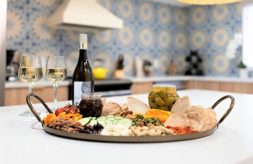 Custom Spanish-style chef's kitchen with quartz counters, oversized fridge, in-island microwave & large pantry