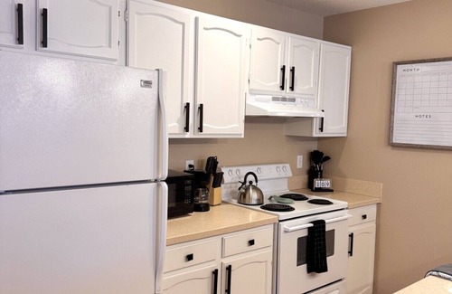 The fully equipped kitchen offers appliances such as stovetop and oven, dishwasher, microwave and full-sized refrigerator as well as basic cooking tools and supplies.