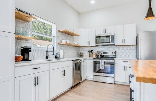 Looking for a home away from home in the Savannah area? This spacious and newly-renovated ground-floor studio has just what you need. You’ll enjoy a queen bed, well-equipped kitchen, dining area, living area, big TV, brand new bathroom, washer/dryer and lots of sunlight. Located behind another house and separated by a fence, the two-unit building has its very own yard. Just 12 minutes from Savannah’s airport and a 17 minute drive to downtown Savannah.
