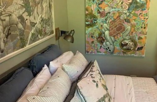 Welcome to our 1930 Artsy Suite, a unique retreat blending, luxury, comfort, and art. Enjoy the original clawfoot tub, custom Stern & Foster mattress, and private porch with serene garden views. Surrounded by one-of-a-kind artworks, this dog-friendly suite features a fully fenced yard for your furry friends. Private entrance, a laundry room, and a focus on comfort and relaxation, As seen on HGTV Hometown season 6 episode 2. Our space offers a truly unforgettable stay.