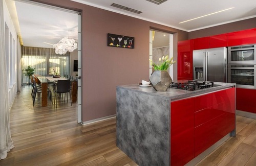 Decorated with close attention to detail, the air-conditioned villa provides all the comforts of a contemporary home. It has 5 beautifully styled bedrooms, the ones on the top floor with access to a large balcony with a lovely view of the green Istrian scenery. There is also an entertainment room with a built-in barbecue, as well as a pool table, darts, and gym equipment. The open concept ground floor features a spacious living room, dining room, and a fully equipped kitchen, allowing a seamless flow into the outdoor area.