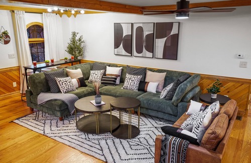 ➤ 400 Sq FT space featuring a large sectional, barstools & bar table, a love seat, and a reading nook.