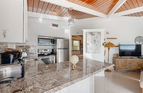 Kick back in the sunny living area after a fun-filled day, where a large sectional sofa provides comfortable seating and the 32-inch Smart TV offers streaming capability. Home chefs will appreciate the modern kitchen, newly appointed with a full suite of stainless steel appliances and granite countertops. When it’s time to eat, you can share home-cooked meals around the table for four in the dining area.