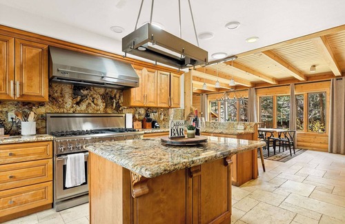 Stepping indoors, the home’s gorgeous interior instantly welcomes you in, perfectly blending the rustic elements of nature with elegant décor and furnishings. The living room includes a plush leather sofa and armchair with a large, mounted smart TV ready to stream all your favorite shows. In the colder months, throw a few logs on the wood fireplace to spark up the perfect ambiance for watching a movie with loved ones while bundled up under a cozy blanket. The chef’s kitchen showcases high-end stainless steel appliances, Viking refrigerator, Thermador 6-burner stove and oven that you won’t even mind spending time preparing meals in, with ample counterspace and cabinetry ready to assist in all your prep and planning. Gather together around the chic dining room table with room for 12, bathed in natural light by the abundance of windows offering picturesque views of the property. A den just off of the master bedroom is quiet place to get away and catch up on a good book with sofa and armchair seating along with a toasty gas fireplace. When you’re ready to kick things up a notch, head to the game room where a full-sized pool table, tabletop arcade game, and electric dart board provide hours of competitive fun.