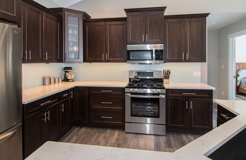 Experience everything Road America and Elkhart Lake have to offer. This 2,500+ sqft home finished construction in November of 2016. It has 4 bedrooms and 3 full baths, quartz counter tops and a great open concept layout that makes it easy to relax. The house has a brand new kitchen and island with quartz counter tops and all new stainless steel appliances. A master bedroom with a king bed along with a private master bathroom, tile shower with glass doors and his and hers sinks allow plenty of room for guests. The other 2 bedrooms on the main level share a full bath. Each of the spare bedrooms on the main level has 2 more beds. There is an additional queen bed/bedroom in the basement along with a full bath in the basement. The lower level living room features a 75" TV, bar with a beer fridge and access to the patio. This home comes with all the standard amenities including a washer and dryer and room to park several vehicles in the driveway.