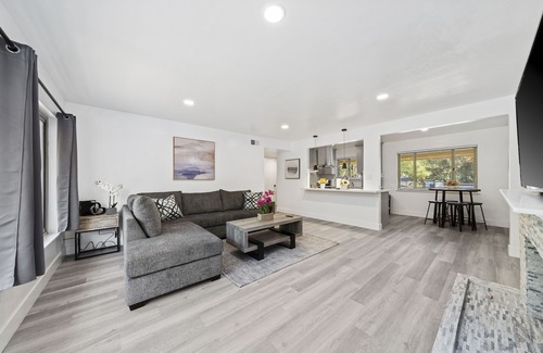 ● Living Room Open floor plan living area with comfy sectional sofa couches and 65" UHD SMART 4K TV with Netflix and other free apps to enjoy streaming movies with your family or friends.