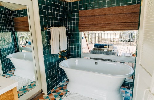 This luxury glamping resort is located on 100 acres of unrivaled wilderness on the San Marcos River. This tent combines luxury amenities with the great outdoors to create a truly unique experience. The modern bathroom comes with a large shower and a spa tub. There is a kitchenette that comes equipped with a refrigerator and freezer, microwave, and a coffeemaker. The living area extends outdoors onto the expansive private deck. There is also an outdoor shower for a truly unique experience. A golf cart is included to explore our 100+ acres and 3/4 of a mile of river frontage on the San Marcos River!