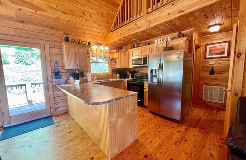 Main level offers a Great Room with stone floor to ceiling gas log fireplace, comfortable seating, TV with streaming capabilities. The open concept main level has dining and eat in bar with seating for 7-8 and a fully equipped kitchen with an ice maker fridge, dishwasher, range, Keurig coffee maker and all you need to make a great meal! The first bedroom is equipped with a king bedroom set. Main level bathroom offers a full bath with tub/shower & dual vanity.