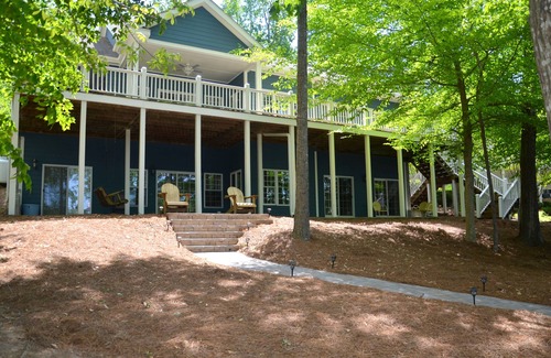 This lake front home is located in a low traffic, open cove, just off the main lake. Enjoy swimming, fishing, boating or just relaxing in the perfect location. Being renters in the past, we have tried to provide all the amenities we always looked for. In this house, the living room furniture is brand new and features 3 reclining leather loveseats (6 seats in total). There are 2 full sized refrigerators and also 250lb Ice machine to keep your coolers and drinks nice and cold. There is only 6 steps and a very gentle slope to the oversized boathouse/sundeck. The new boat house features a second story sundeck, all composite decking, a bar area as well as a small refrigerator/freezer and many more upgrades. There are lots of water toys that both children and adults can enjoy. We have extra lifejackets and towables for those who bring their own boat. Our boats remain on the lifts, however, we will have 10 bumpers to tie your boats on both sides of the deck. Every bedroom and both living areas are lake front and have sliding glass doors to the lake. This house also has free high speed internet/Wi-Fi and a satellite televisions in both living areas.