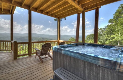 This 4-bedroom cabin rental is perfect for large families and groups of friends! Whether you're hanging out on the wrap-around porches and grilling or relaxing in the hot tub, cozying up next to the indoor/outdoor fireplaces, or enjoying the spacious floor plan, the stunning mountain views offer the perfect backdrop to your relaxing mountain getaway!