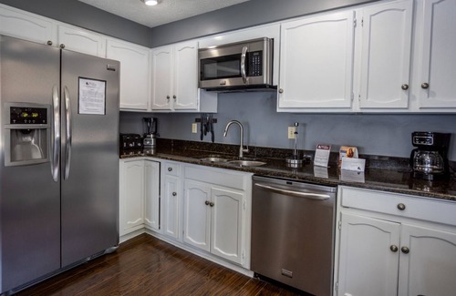 The kitchen with white cupboards and dark granite countertops has an oversized kitchen island and upscale appliances. Guests will have plenty of space for preparing and serving meals. The dining table is situated just in from the sliding glass doors leading the way to the lake. The living room offers quality, comfortable furniture and a decorative fireplace.