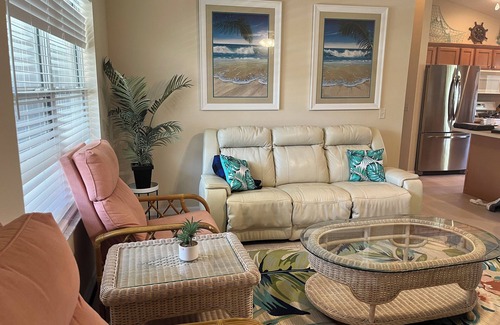 You’ll be welcomed and relaxed as soon you open the front door to your home away from home. This home has everything you need including, premium bed linens and bath towels. The master bath offers an extra tall walk-in shower with seating bench. The kitchen is appointed with a Gas stove and a and newer dishwasher, and refrigerator, and is complete with everything you'll need to prepare and serve meals. The living room offers plenty of comfortable seating, including a leather power reclining sofa, - and 2 Reclining chairs . And if your entertaining friends & family or just enjoying your favorite television shows enjoy the larger flat screen TV in the living room . And of course, there's a charming screened in lanai where you will find a table, chairs and flat screen tv for you to enjoy reading the morning paper or watching the morning news with your coffee. Each of the Bedrooms, living room and Lanai have a ceiling fan.