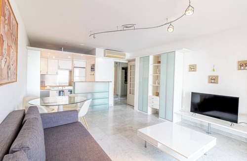 The apartment consists of a living room with sofa bed, television, Wifi and dining table. At the back of the room an open kitchen equipped with oven, dishwasher, microwave, kettle, Nespresso coffee machine, toaster, cooking equipment and dishes.
