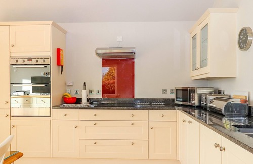 Amenities: Gas-fired underfloor central heating throughout. The kitchen is well equipped with electric double oven, induction hob, microwave, fridge/freezer, washer-dryer, dishwasher and Tassimo coffee machine. Smart TV with power amplifier, TV, WiFi, Blu-ray/ DVD player, digital radio. Fuel, power, and starter pack for woodburning stove inc. in rent (more wood can be purchased from on-site shop). Bed linen and towels are included in the rental with towelling bath robes and slippers in the master bedroom plus additional towels for use in the Swandown pool area. Adjacent off-road parking for two vehicles. The private south facing garden has fabulous views and provides table, chairs and parasol plus two loungers and a barbecue. Communal indoor swimming pool. Sorry, no pets and no smoking. Shop 3.6 miles Pub 0.2 miles. The Swandown site has an indoor heated swimming pool for the exclusive use of guests staying at the lodges - the pool can be booked for private use by individual lodges 48 hours in advance and the booking rota is located in reception.