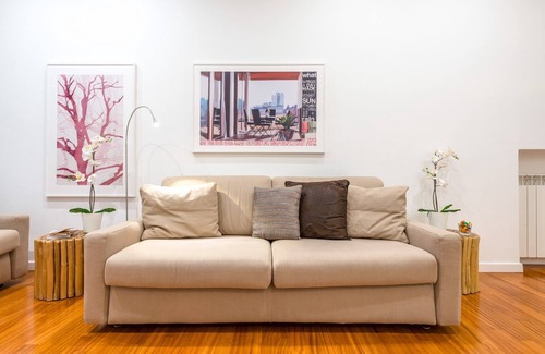 Hang a coat on the hooks accented with sweet wicker hearts. It is the little touches that make this apartment a gem, from furniture and artwork that combine to create a welcoming vibe to the botanical details that promote serenity.