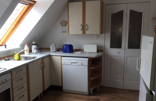 The house with large garden is located on the edge of the forest in a charming family home district. The location is quiet, yet central, a few minutes from the center. Two apartments are located on the upper floor of the house. The lower floor is used by the host for their own holidays. The apartments can be reached via a separate external staircase. Each apartment has a living room with balcony, 1 bedroom and a shower room. In the middle of the two apartments is a large communal kitchen. In the main season of July and August, only both apartments are rented together if possible. Both apartments together offer sleeping possibilities for 8 persons. The apartments are equipped with satellite TV, radio with CD player. Internet via Wi-Fi is available. Sheets and towels were provided. The kitchen has a dishwasher, washing machine, 2 coffee machines, 2 refrigerators, 1 freezer, kettle, microwave, toaster, electric cooker with Ceramkochfeld and oven, dishes, pots etc. The garden can be used by the guests, also for barbecues. Secure parking is possible on the property. The property is protected by a security company. House and property are secured by an alarm system.