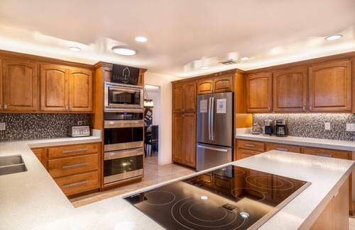 *Chef’s Kitchen: Fully stocked with high-end stainless-steel appliances, double ovens, and additional dining seating for 8. Opens directly to the back patio