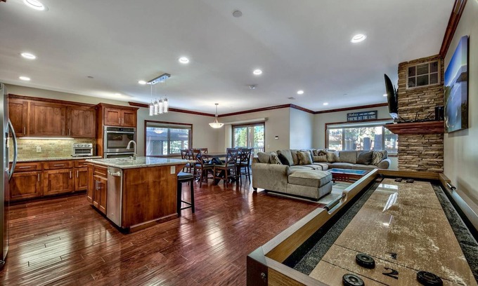 The open-concept floor plan at Tahoe Woods 602 creates the perfect atmosphere for reconnection & relaxation. The spacious living area is perfect for cozying up around the stone fireplace or watching a movie on the mounted 55” HDTV. Enjoy a bit of family competition at the Shuffleboard table. Making this room all the more inviting, the large windows let in incredible natural light.