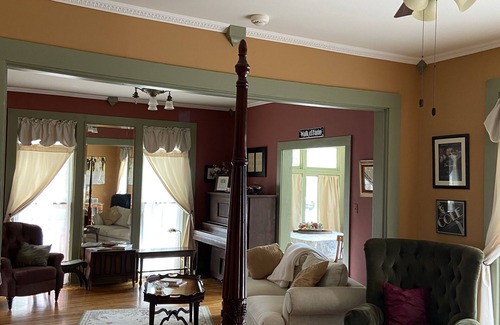 The ‘Kiss Me Kate’ open concept studio apartment located in The Cole Porter Inn showcases the charm of the 20’s with ten foot tall ceilings, an antique piano and floor to ceiling mirrors. Perfect for extended/longer stays, this sunny space has been renovated with a new washer/dryer, shower, and full kitchen complete with sink, dishes, stove and microwave. It has a king sized bed and lovely living area. Wi-Fi and Smart TV for entertainment. As with the era of the build, the rooms include a sunroom and sitting area. What sets the Kiss Me Kate suite apart is the private entrance and outdoor porch/patio area for relaxing and unwinding. Complete with all supplies needed for extended stays.