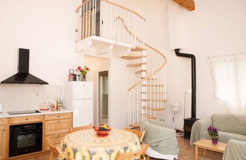 The Gite Living Area is open-planned with kitchen, dining and sitting areas. With its high ceiling, roof beams and spiral staircase, the living area has a very spacious feel to it.