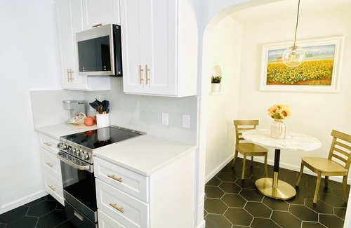 The VRBO Rental is for the main floor of this home. It is newly renovated and updated, with all brand new, tasteful furniture and has central air (cooling and heating), 2 bedrooms, 1 bathrooms, with 2 comfortable beds (one king, one queen), a 14 foot comfortable couch, 1 bath, full kitchen, access to washer&dryer, driveway parking, big screen HDTV with FuboTV, Hulu, Netflix, and Google Fiber WiFi.