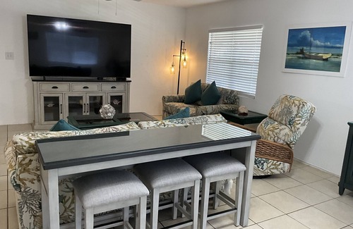 Charming property that is a ten minute walk to the beach. This is a perfect location with the smoothest waters on the island. Historic Frederiksted is less than a mile away. Beautiful sunsets and ocean views can be enjoyed while relaxing on an oversize porch. Rainbow Beach is just a fifteen minute walk with good food, jet skiing and more. Property has two queen size beds, one king size bed, full kitchen and a 65" flat screen TV. For your convenience, this propriety has wi-fi, washer/dry and everything you need to make yourself at home.