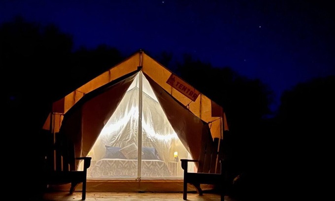 Your Tentrr campsite includes a 10'x12' (120 square feet) safari-style canvas tent on a raised wooden platform. Inside the tent you'll find one queen bed with a memory foam mattress. The tent is big enough for the bed plus one or two extra sleeping bags on the floor. Aside from the canvas tent, campers can also use the extra 5-person pop-up dome tent that’s provided. You'll also have a 6-ft picnic table, outdoor fire pit, and 2 Tentrr Adirondack chairs.