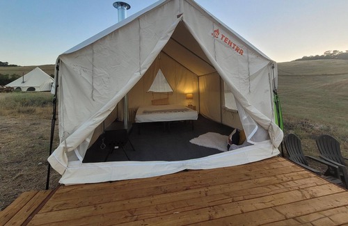 Your Tentrr campsite includes a 10'x12' (120 square feet) safari-style canvas tent on a raised wooden platform. Inside the tent you'll find one queen bed with a memory foam mattress. The tent is big enough for the bed plus one or two extra sleeping bags on the floor. Aside from the canvas tent, campers can also use the extra 5-person pop-up dome tent that’s provided. You'll also have a 6-ft picnic table, outdoor fire pit, and 2 Tentrr Adirondack chairs.