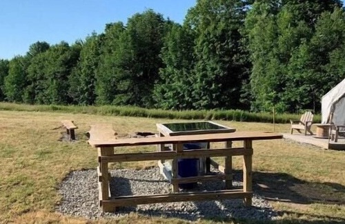 Each campsite includes a 10'x12' safari-style canvas tent on a raised platform, and you'll find one queen bed or a queen-size bunk bed inside (each site is different, see photos for the exact setup). Larger groups can also use the extra 5-person pop-up dome tent that’s provided (you’re welcome to bring your own camping gear too). You'll also have a 6-ft picnic table, outdoor fire pit, 2 Tentrr Adirondack chairs, and a heating source to keep you warm and toasty at night.